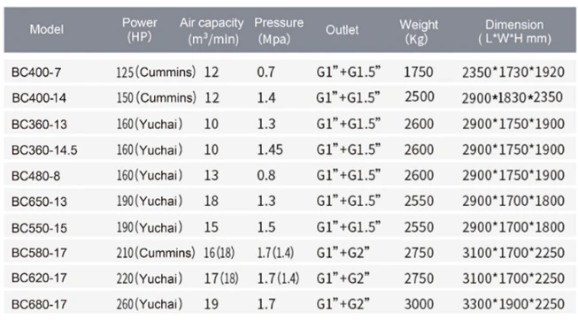 O compressor de ar diesel BLB tem um layout compacto e razoável, manutenção conveniente, capacidade de ar suficiente, pressão estável, design de comutação de um botão de pressão dupla e pode atender às condições de trabalho de perfuração de 90-200mm até o poço e perfuração de âncora exigidas pela engenharia e mineração em alta pressão. Também pode atender às condições de trabalho da máquina de shotcrete a baixa pressão.